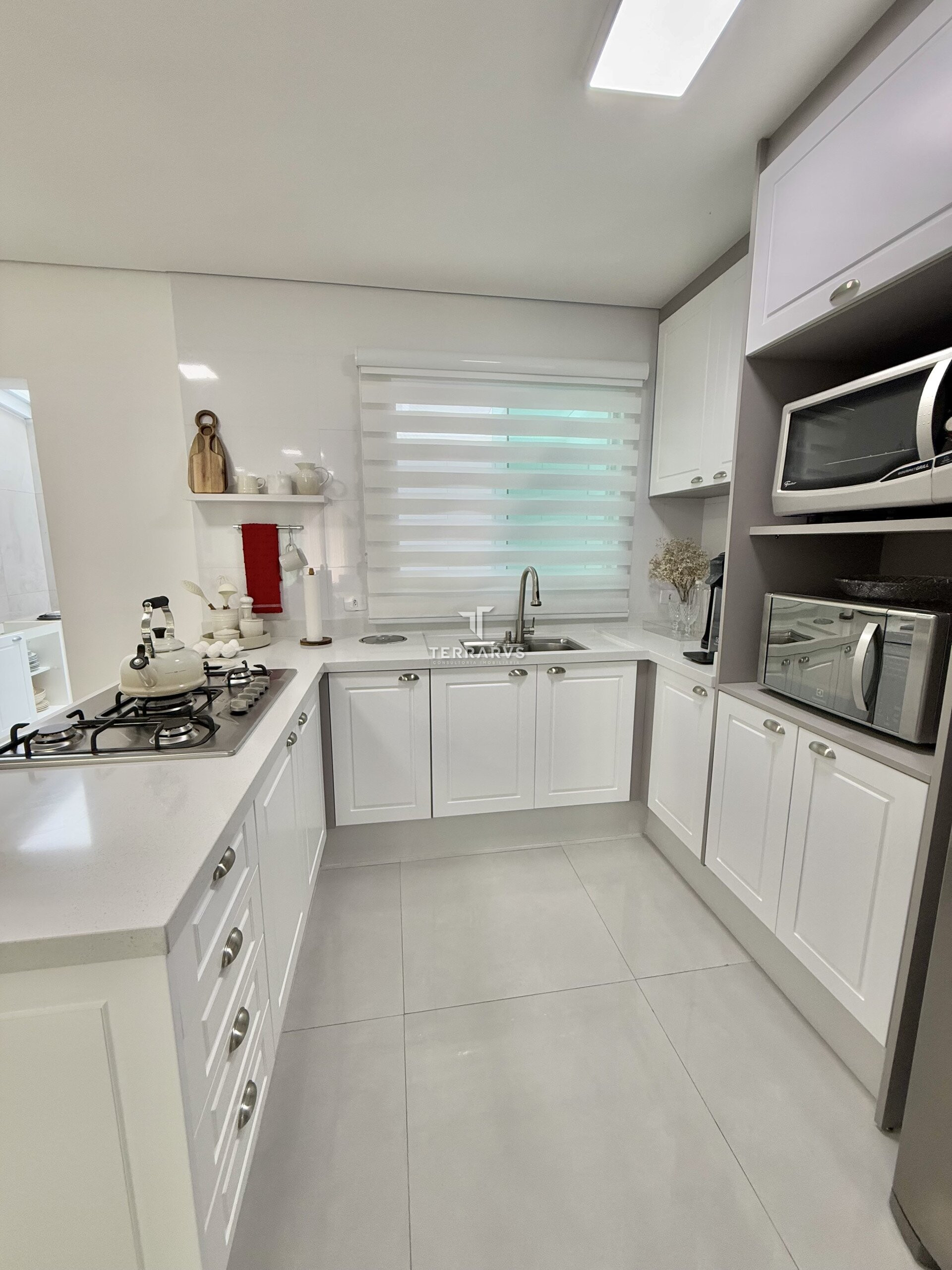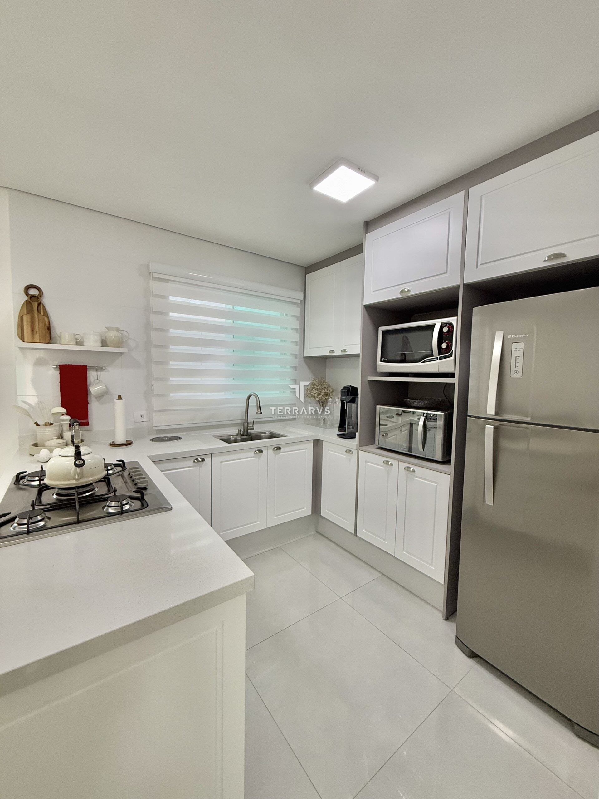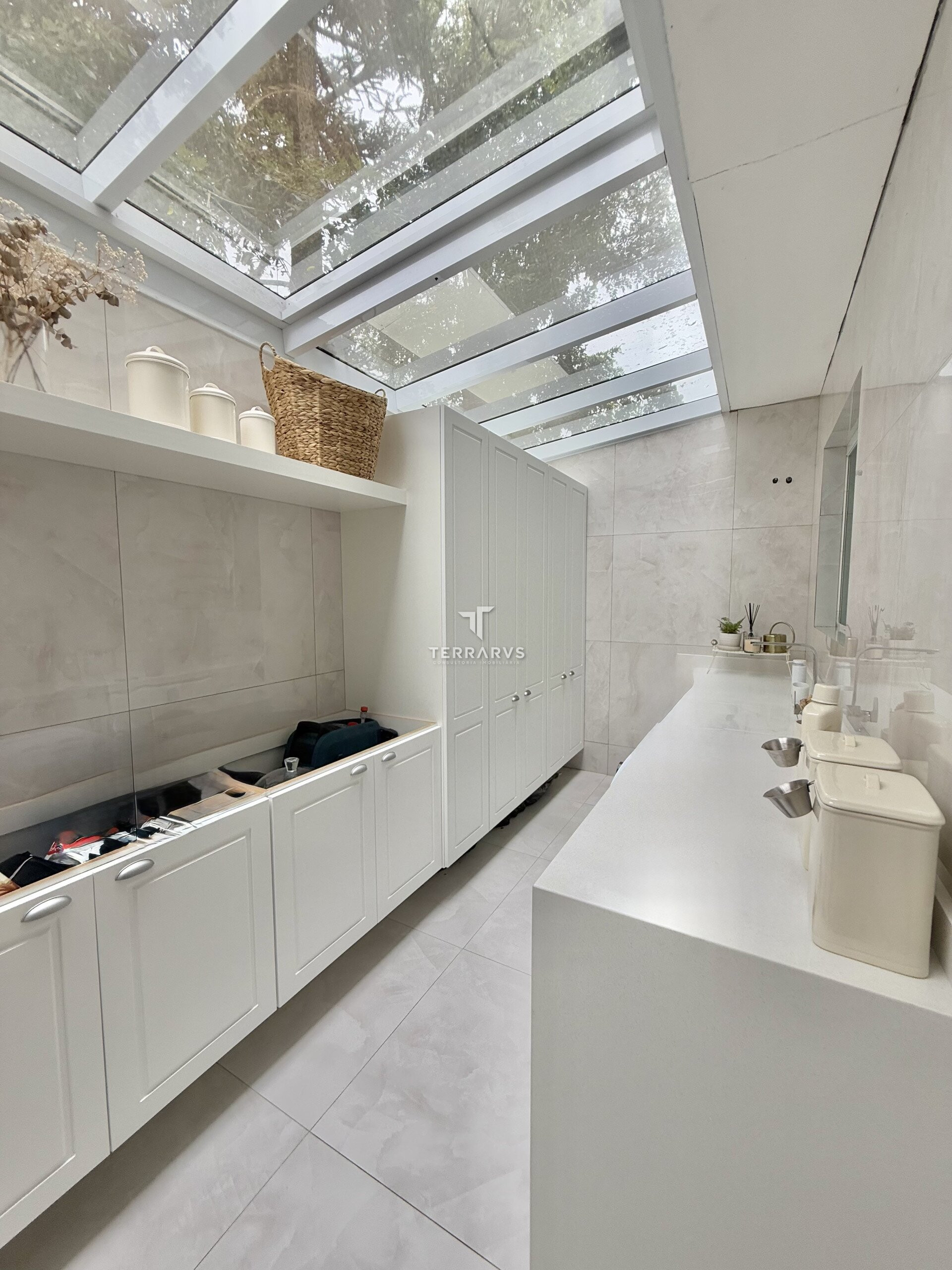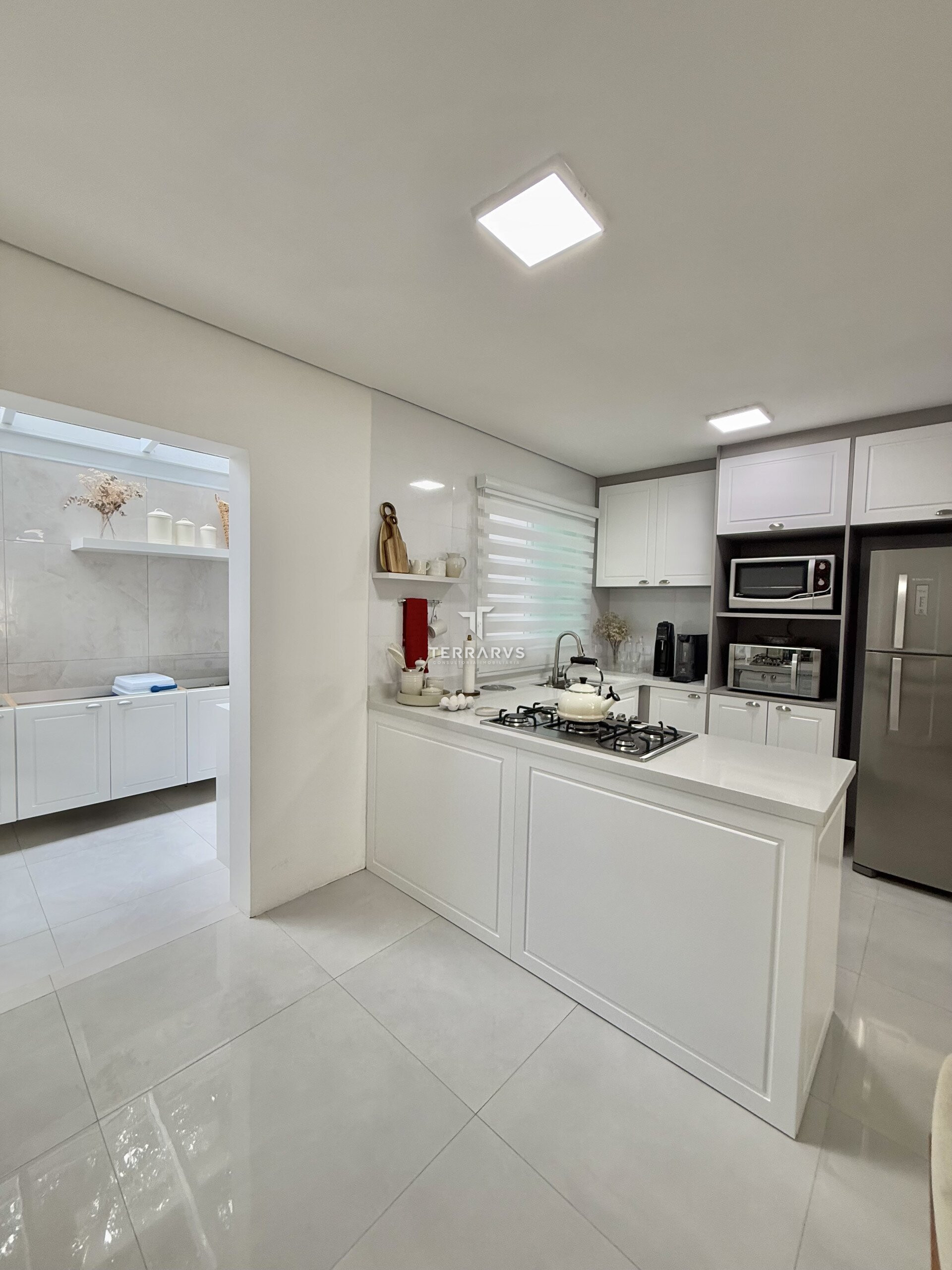 A cozinha possui móveis planejados, assim como a lavanderia, garantindo organização e praticidade no dia a dia. A sala de TV conta com painel planejado e a suíte dispõe de armários sob medida.