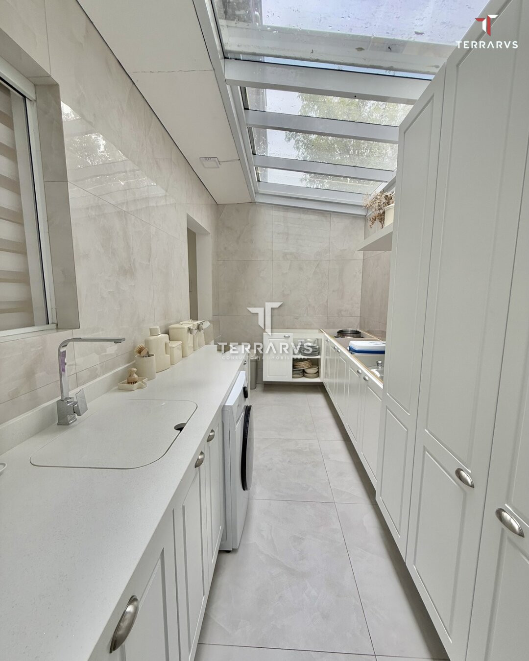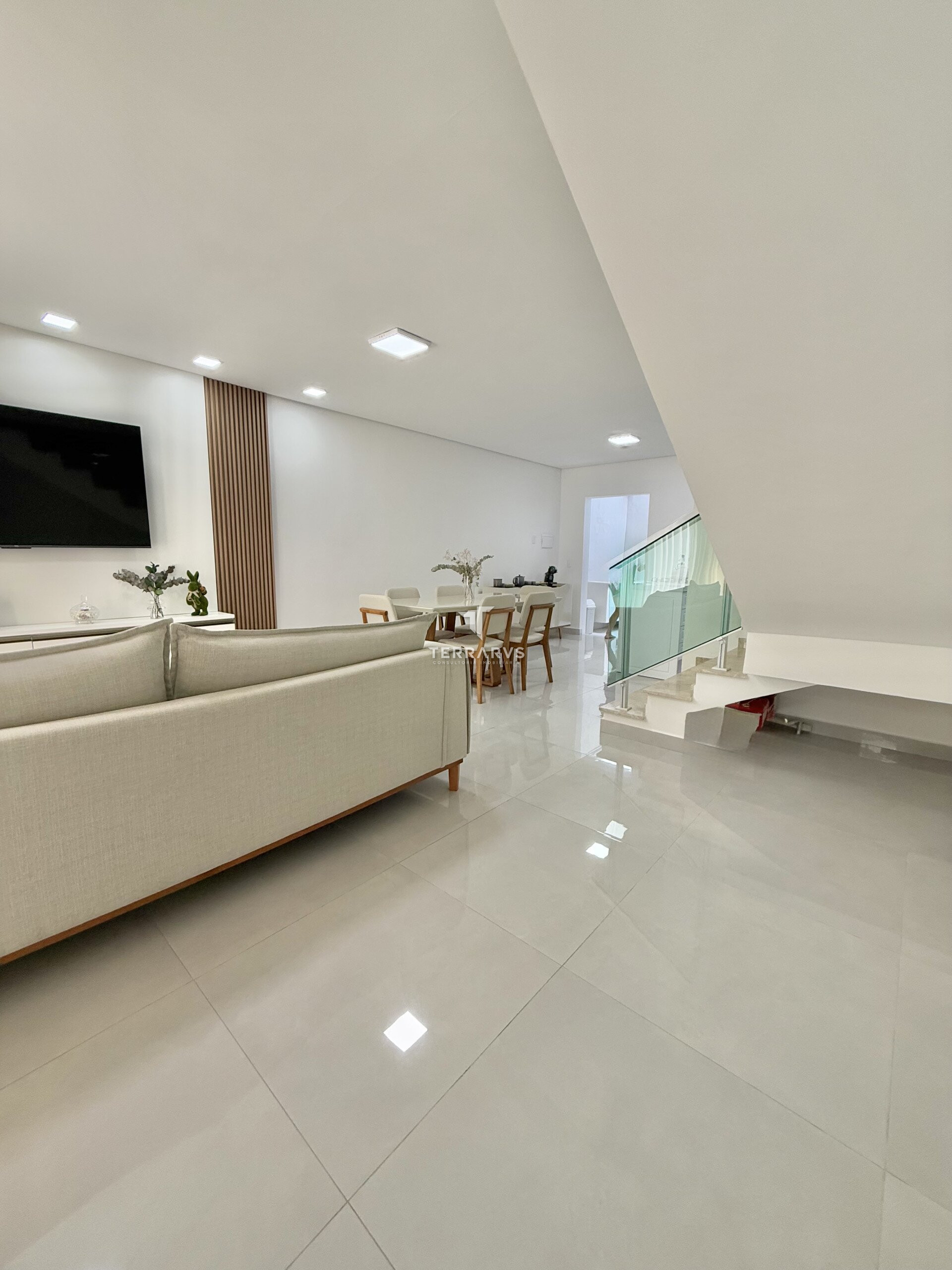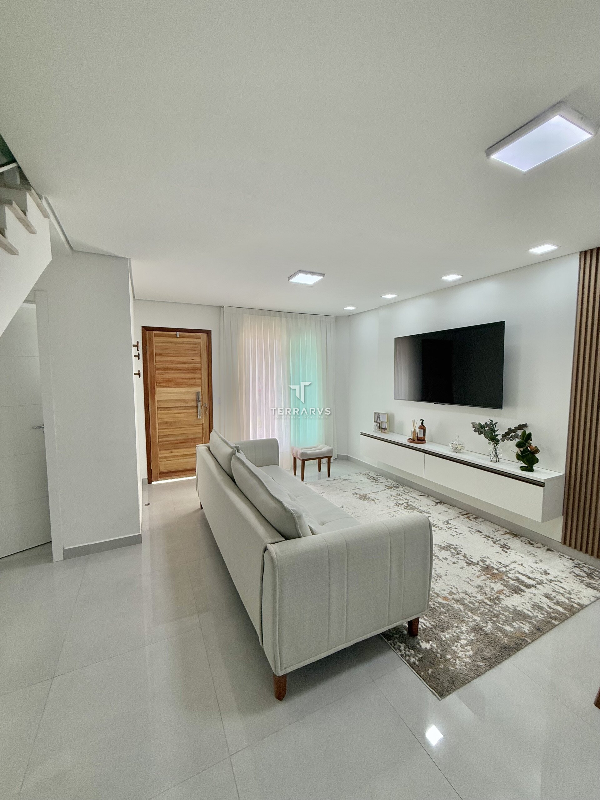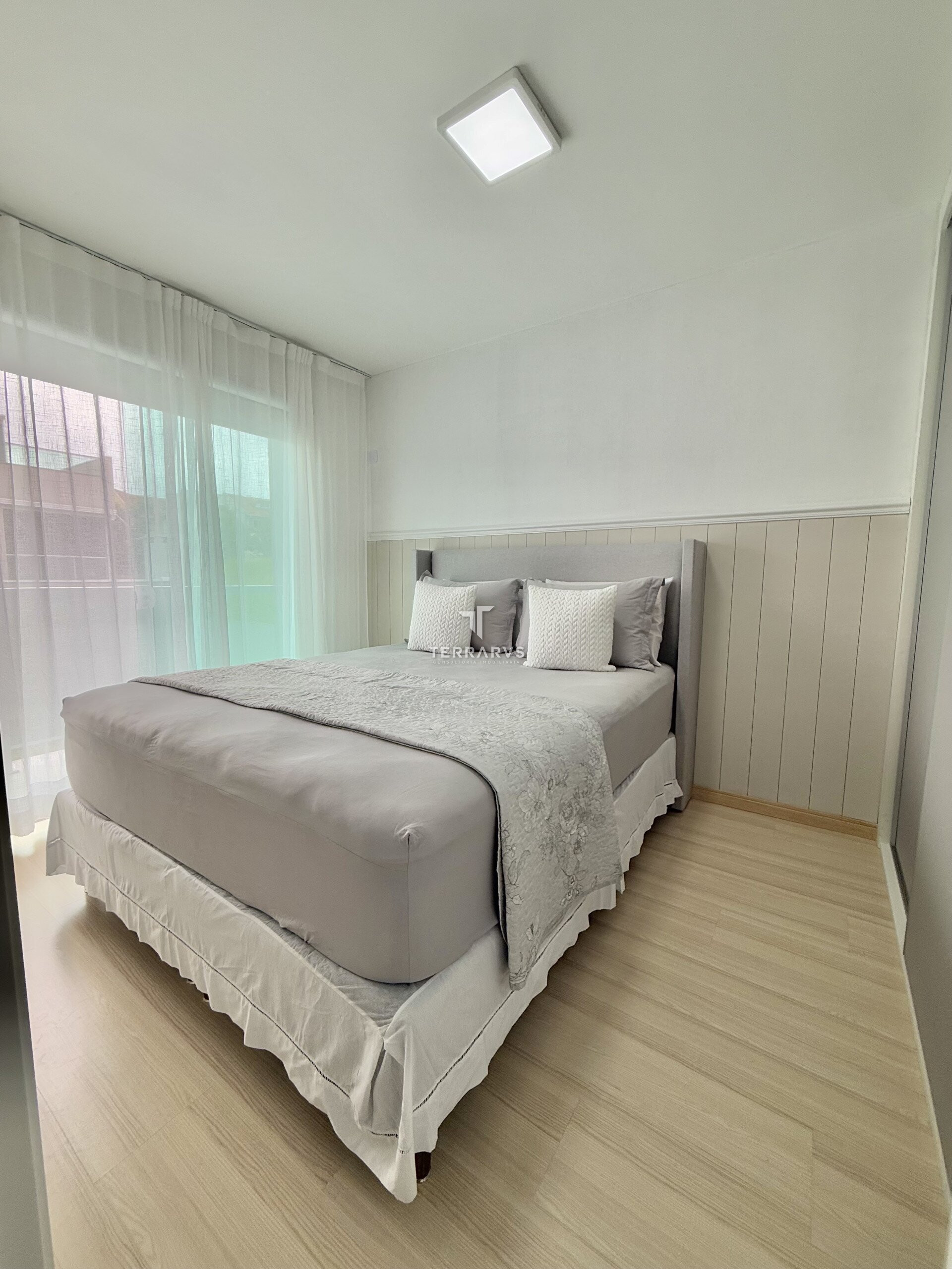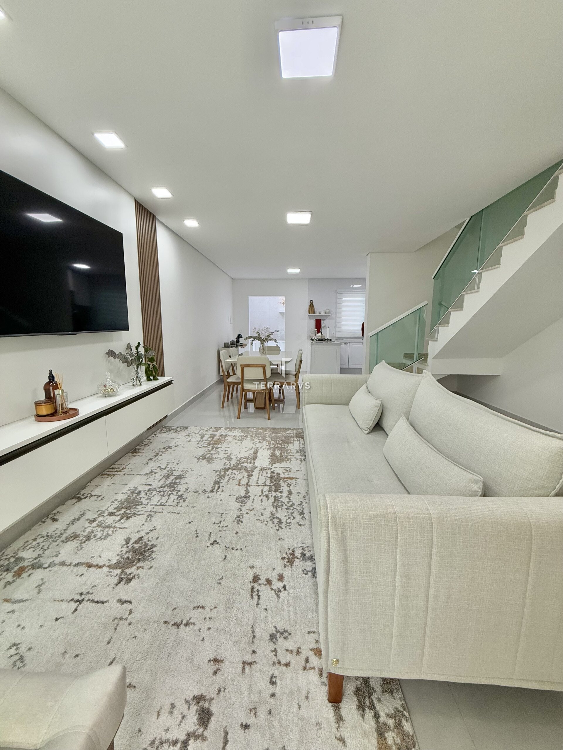 A cozinha possui móveis planejados, assim como a lavanderia, garantindo organização e praticidade no dia a dia. A sala de TV conta com painel planejado e a suíte dispõe de armários sob medida.
