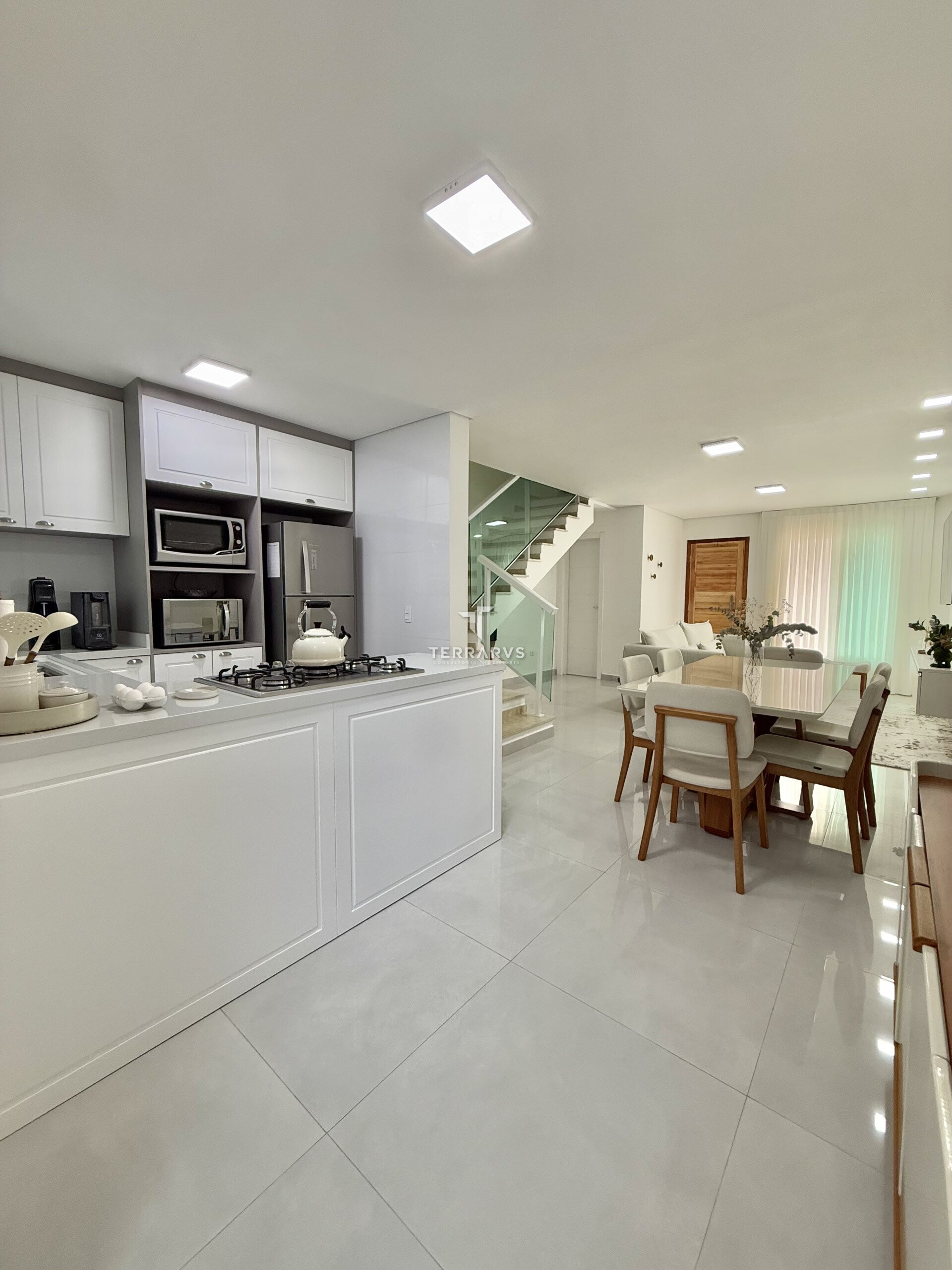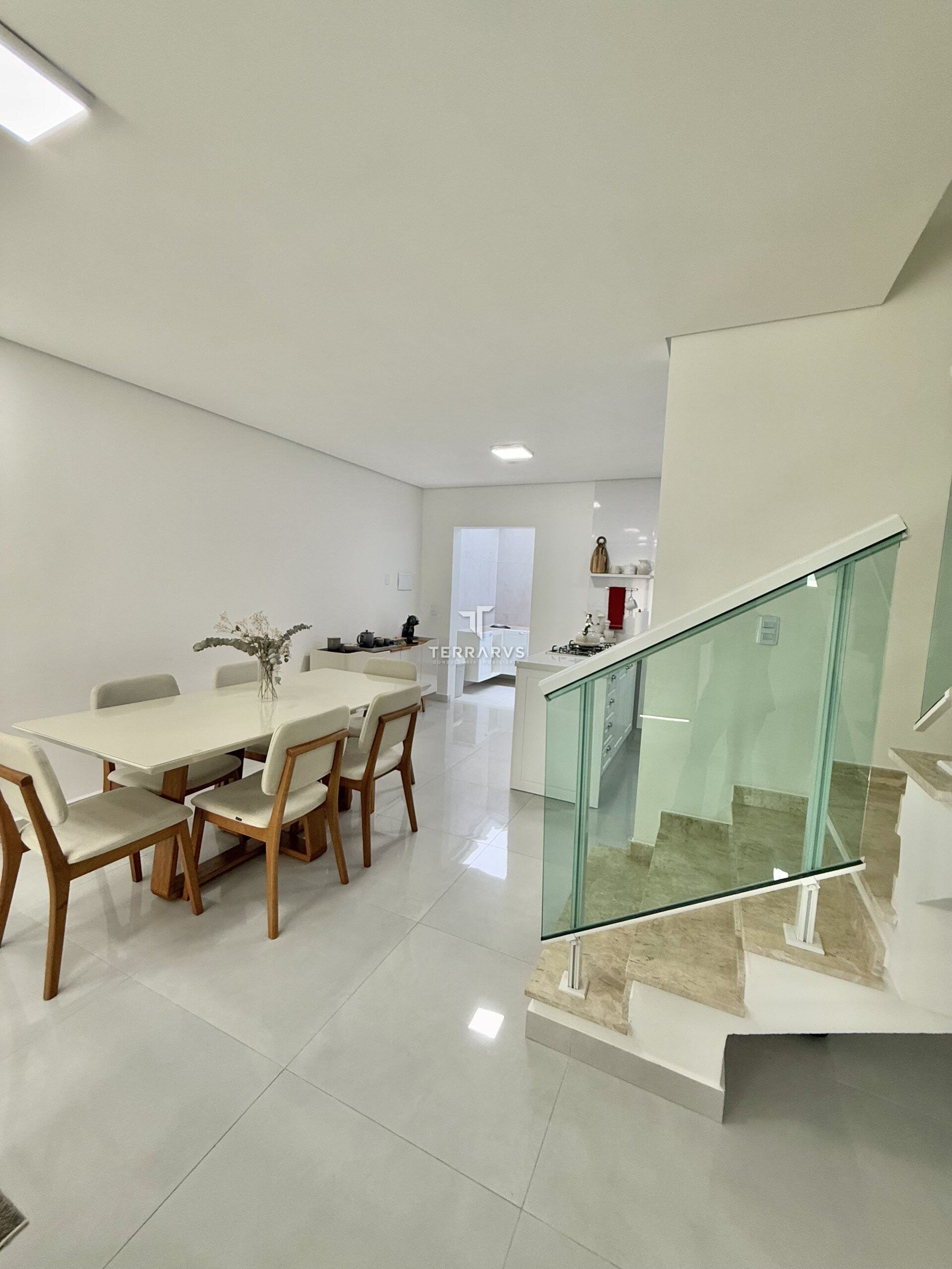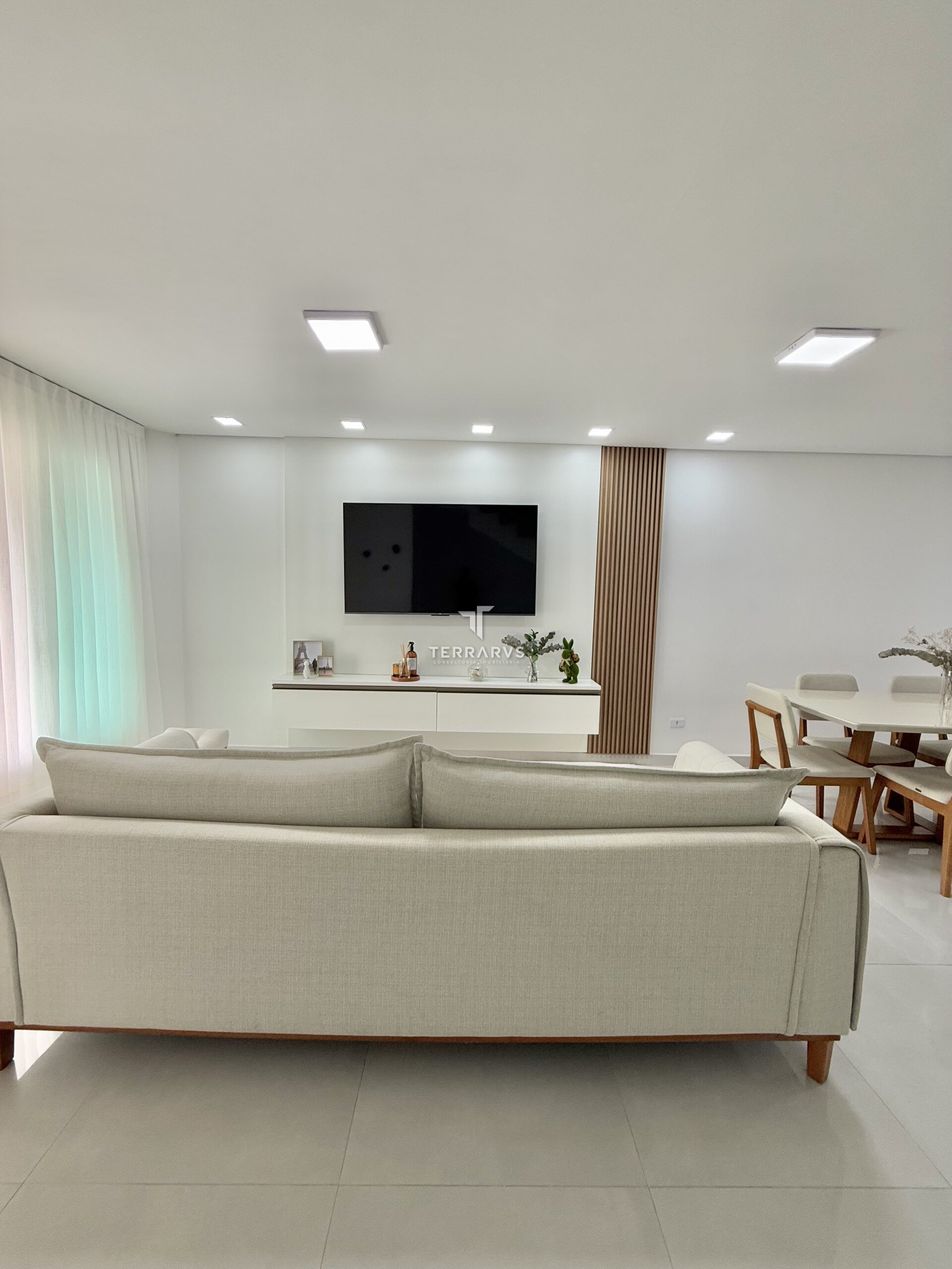 O imóvel conta com três dormitórios, sendo uma suíte com armários planejados. Os ambientes sociais são integrados, com sala de estar e sala de jantar em conceito aberto, proporcionando amplitude e boa iluminação natural.