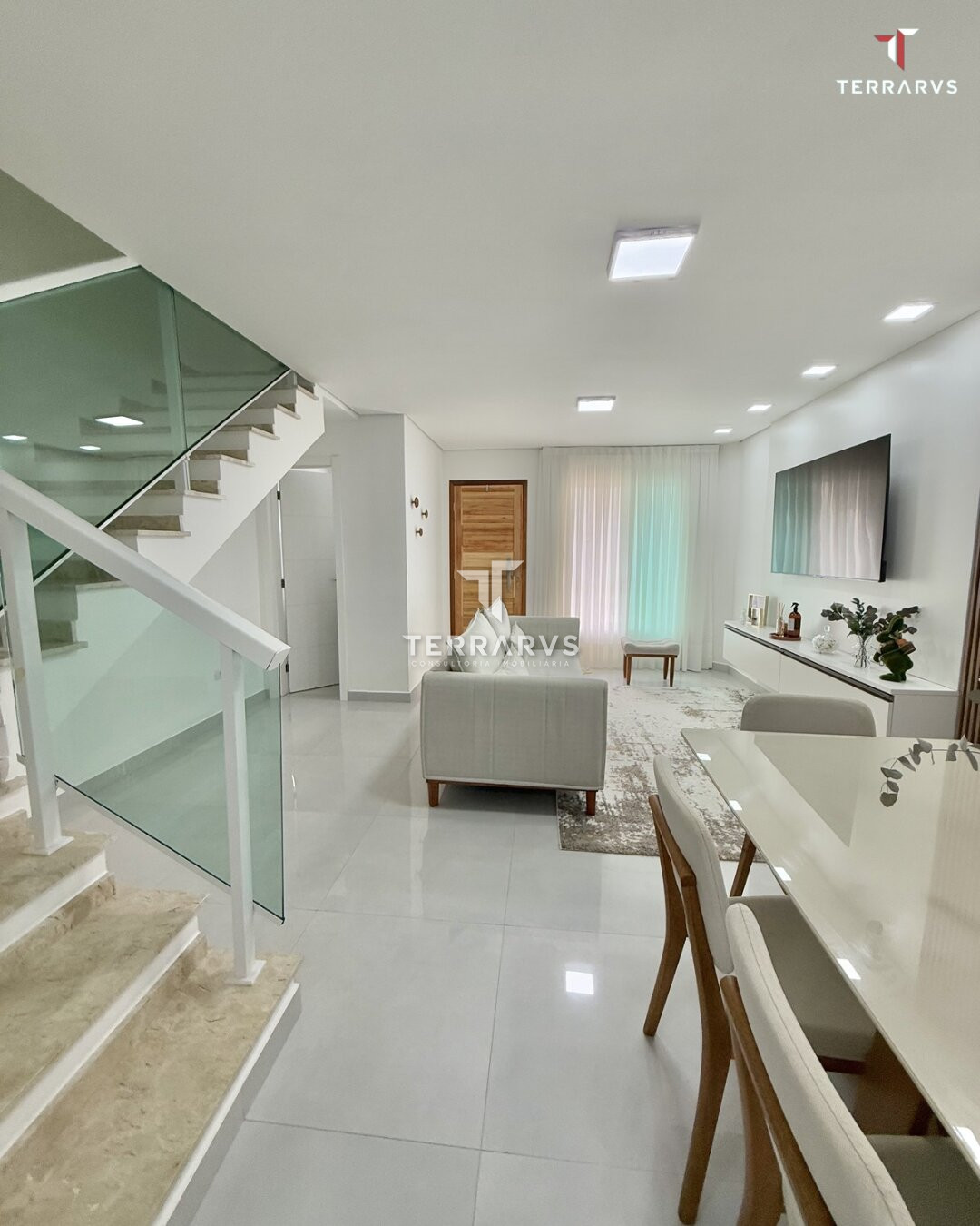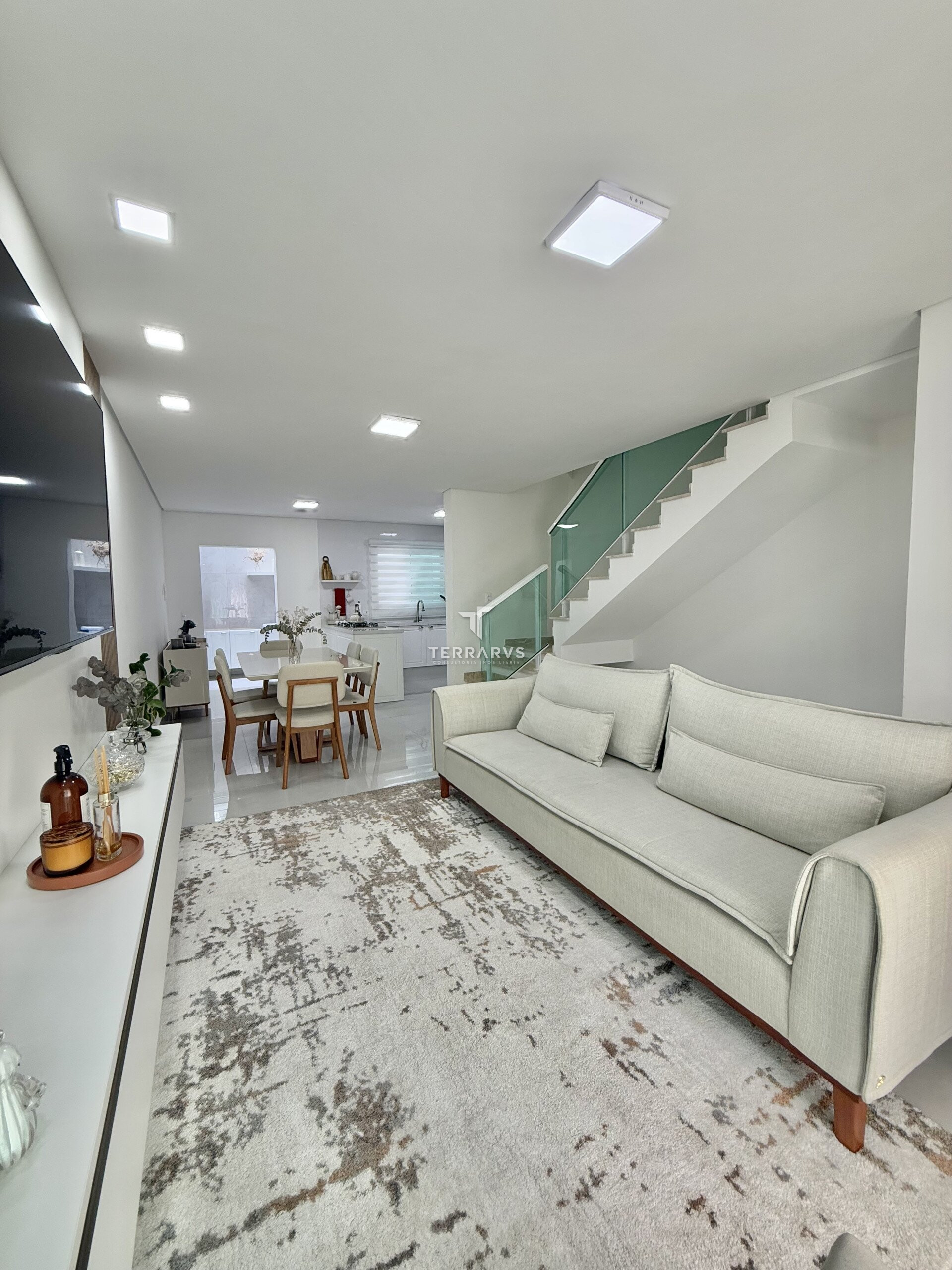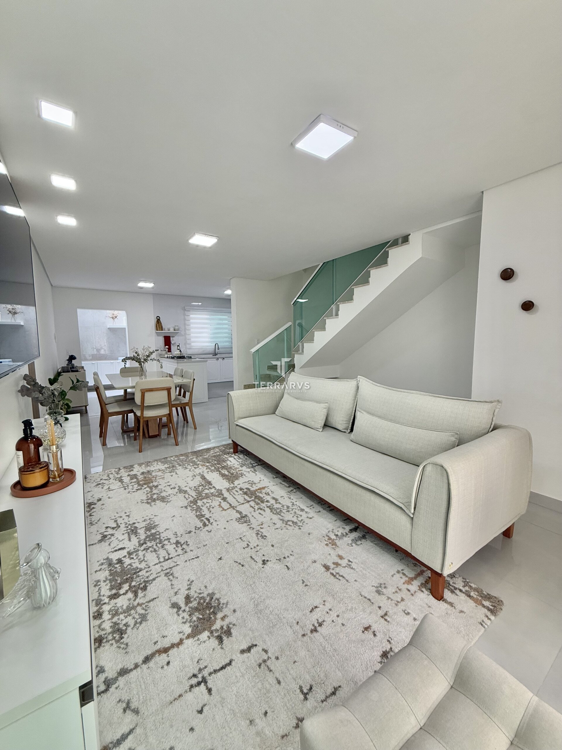 O imóvel conta com três dormitórios, sendo uma suíte com armários planejados. Os ambientes sociais são integrados, com sala de estar e sala de jantar em conceito aberto, proporcionando amplitude e boa iluminação natural.